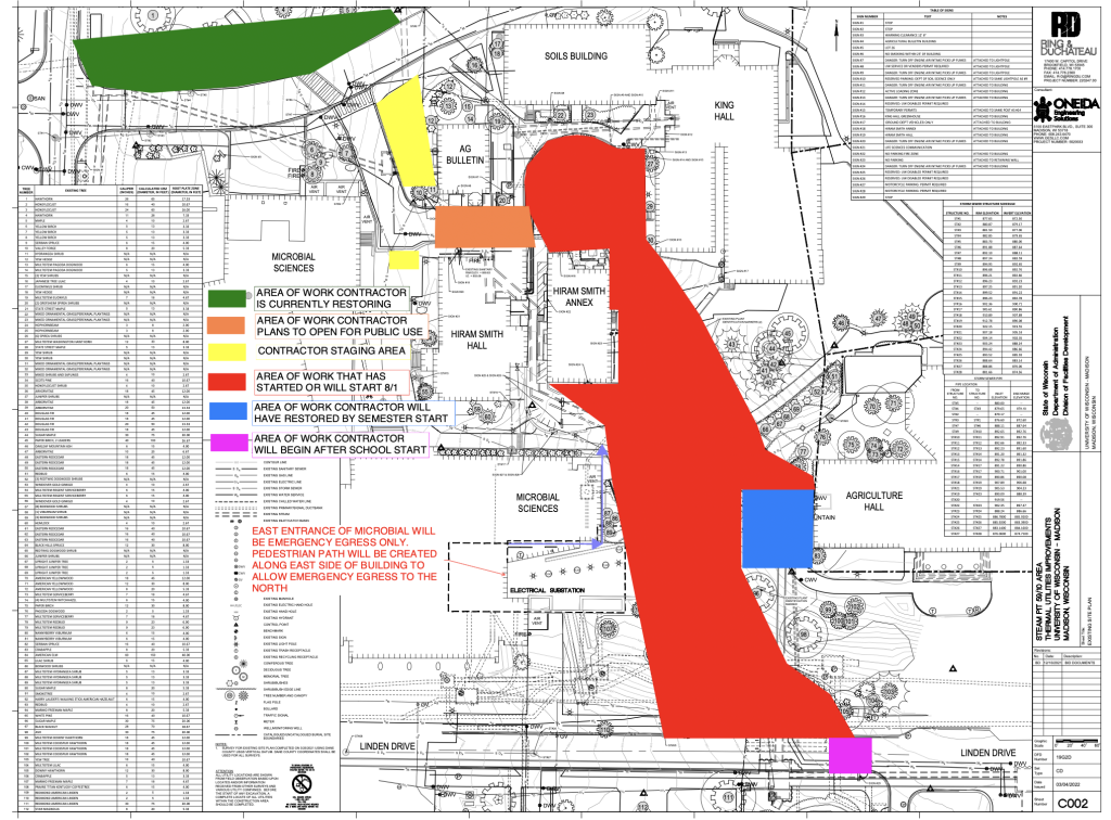 - The pedestrian path that runs along the east side of Microbial Sciences will be closed. There will be some selective demo of benches and concrete in that area.
