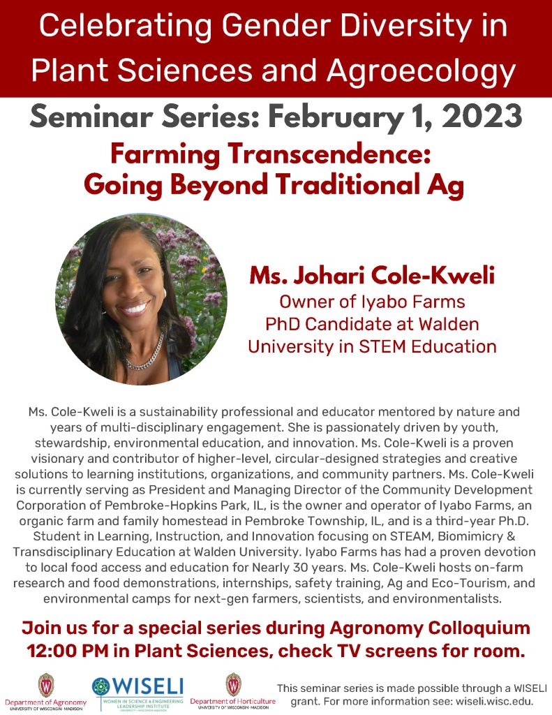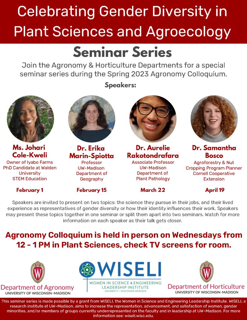 Join the agronomy and horticulture departments for a special seminar series during the Spring 2023 Agronomy Colloquium: Celebrating Gender Diversity in Plant Sciences and Agroecology. The Agronomy Colloquium is held in person on Wednesdays from 12:00 p.m.-1:00 p.m. in Plant Sciences (check TV screens for room).