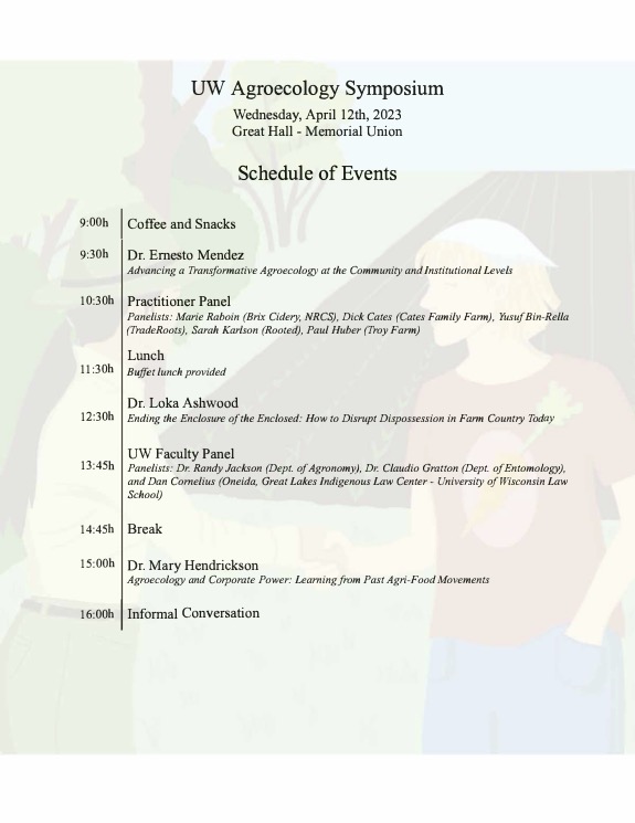 The UW Agroecology Symposium is set for April 12 from 9:00 a.m.-5:00 p.m. in Memorial Union’s Great Hall. A detailed schedule is available to view below and for download here.