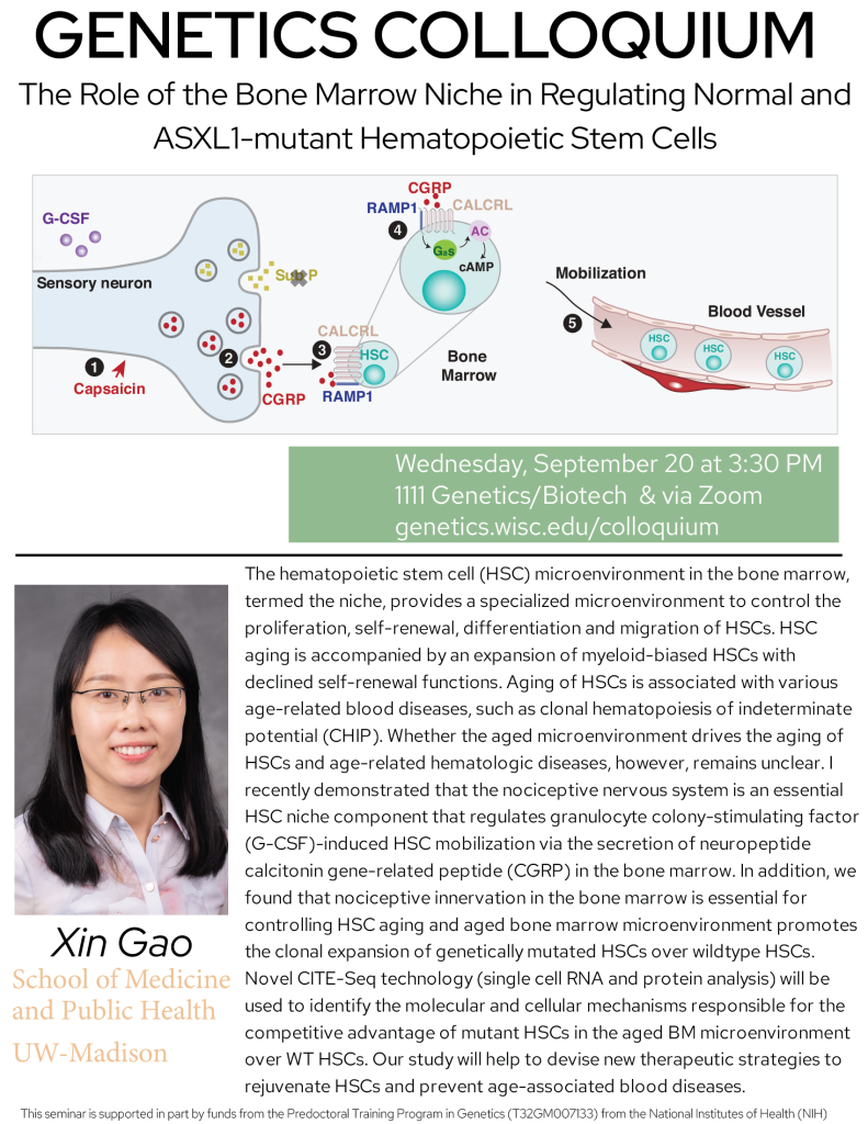 Genetics Colloquium: Xin Gao on the role of the bone marrow niche in regulating hematopoietic stem cells – Sept. 20