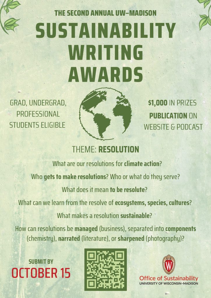 The second annual UW–Madison Sustainability Writing Awards are inviting submissions from UW graduate students, undergraduates and professional students. In addition to awarding a total of $1000 in prizes, the winners’ work will be published on the Office of Sustainability website, and they will appear on the SustainUW Podcast (if they so choose).