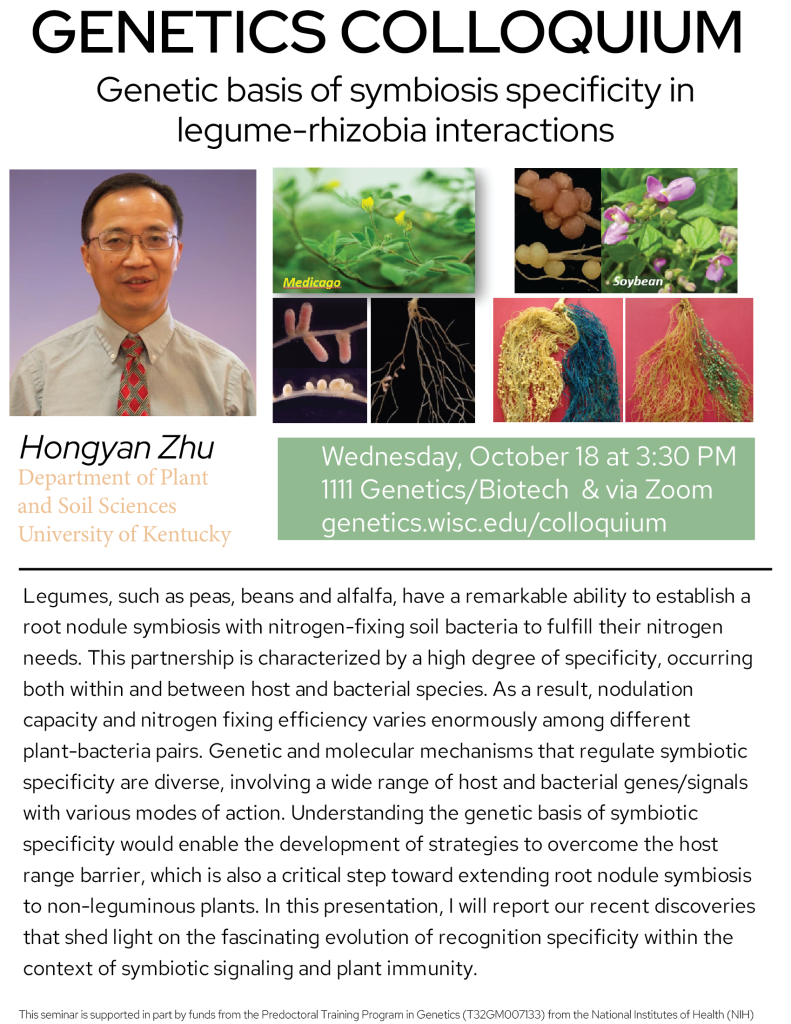 Genetics Colloquium: Hongyan Zhu on the genetic basis of symbiosis specificity in legume-rhizobia interactions – Oct. 18