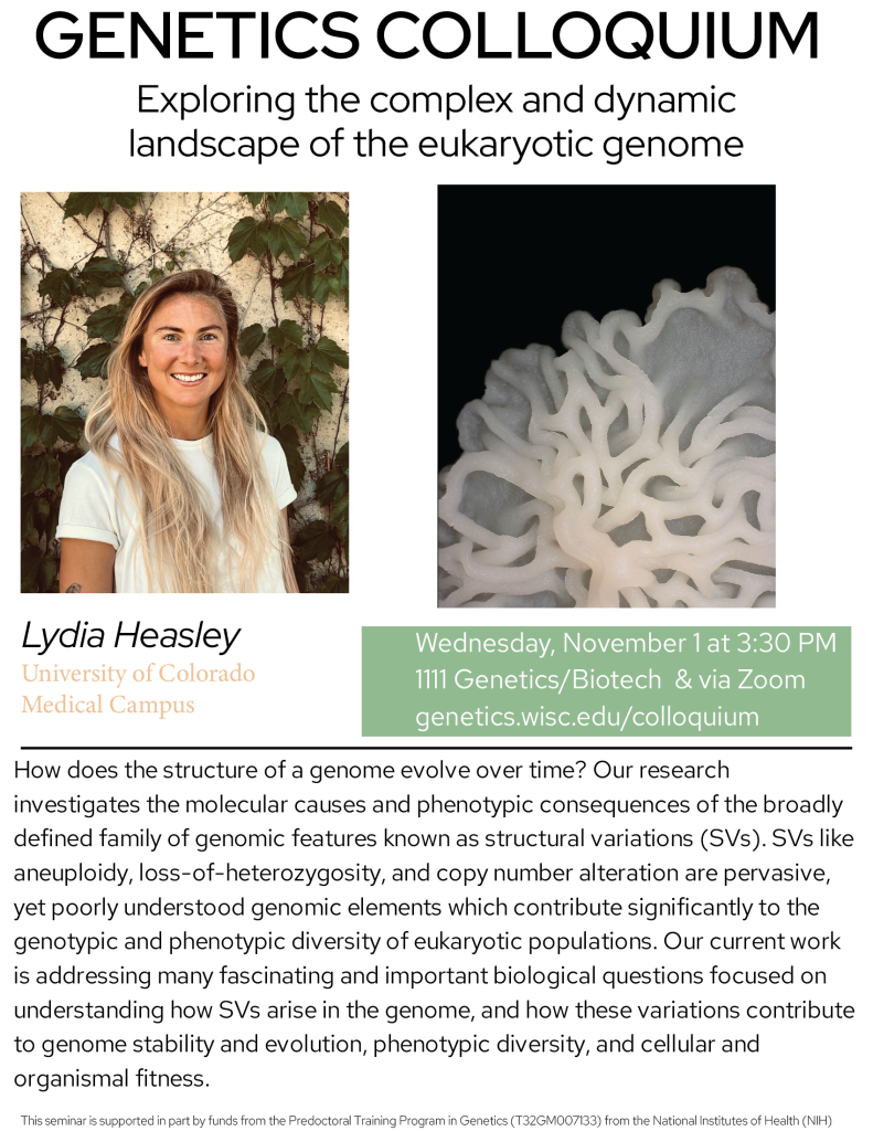 Genetics Colloquium: Lydia Heasley on the complex and dynamic landscape of the eukaryotic genome – Nov. 1