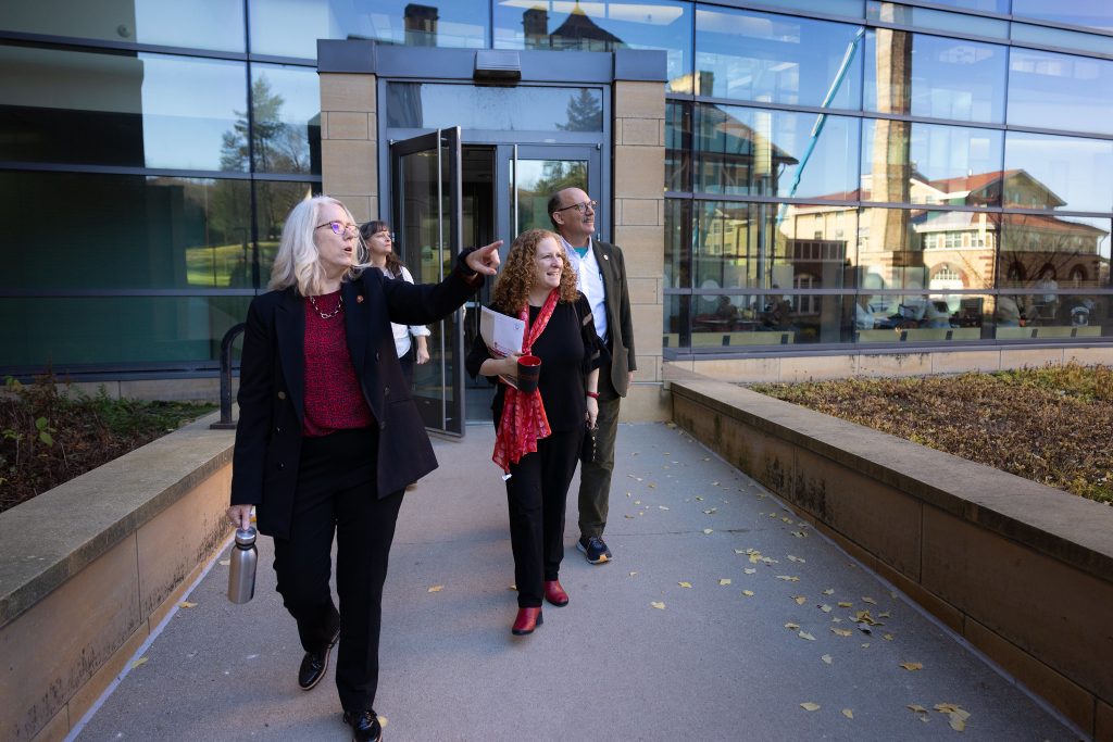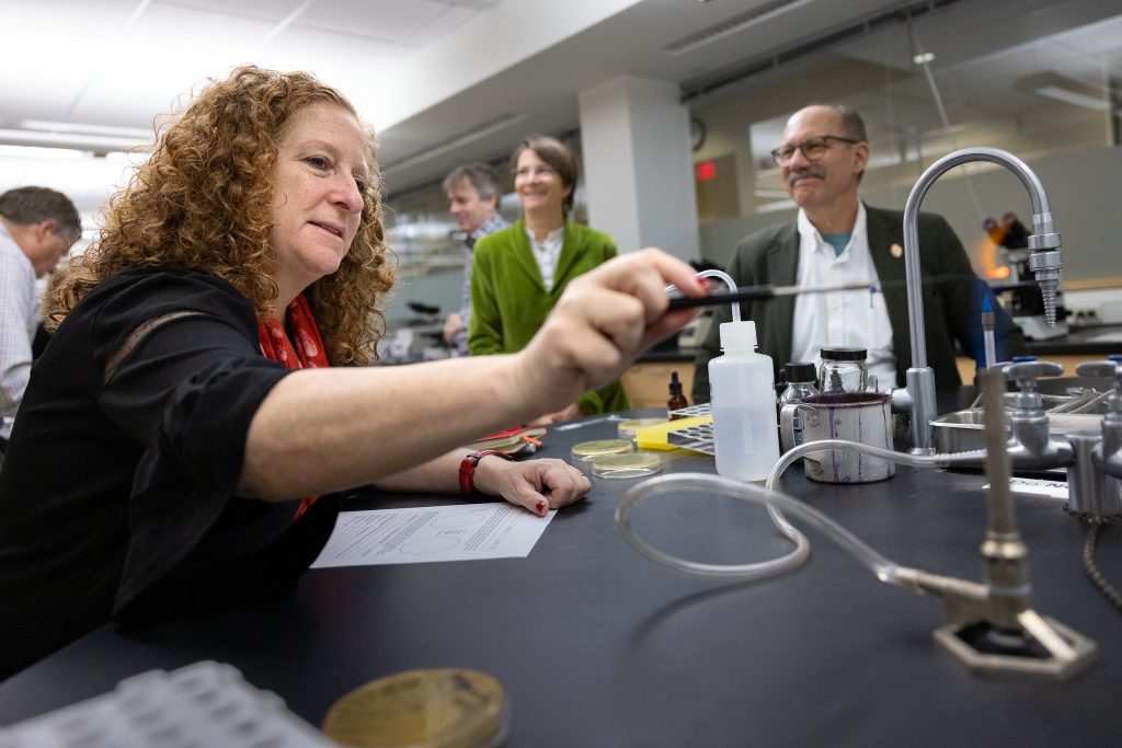 UW–Madison Chancellor Jennifer Mnookin sterilizes an inoculation loop during a lab exercise in the Microbial Sciences Building on Nov. 6, 2023. In background are Katrina Forest, center, professor and chair of the Department of Bacteriology, and Doug Reinemann, right, CALS associate dean for outreach and extension.