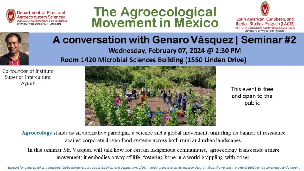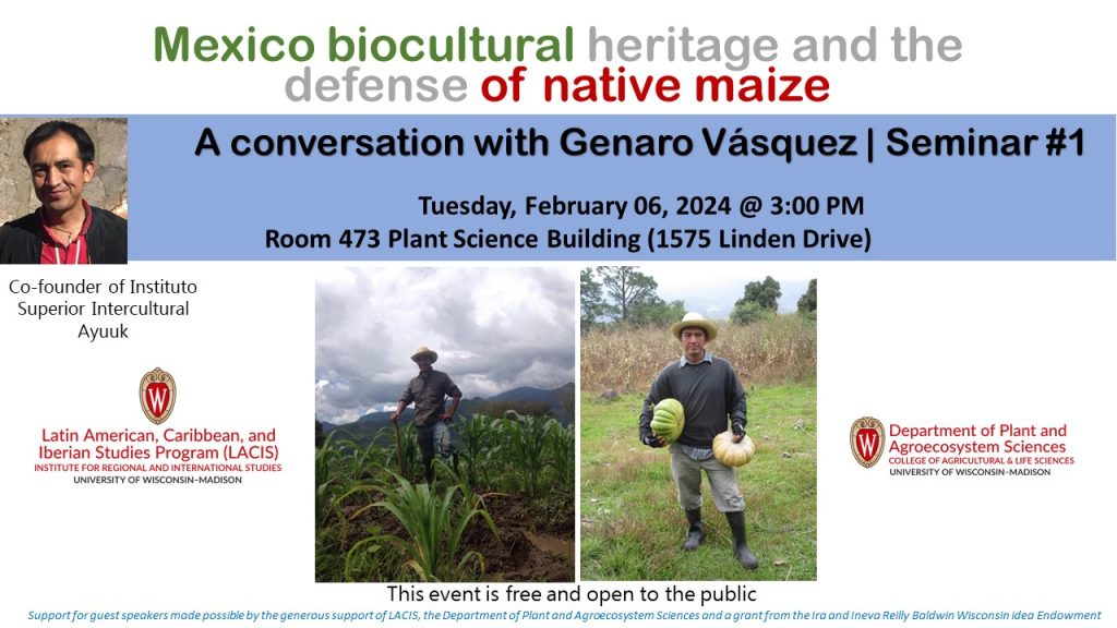 Genaro Vasquez, Indigenous scholar from Oaxaca, Mexico and co-founder of Ayuuk Intercultural Institute, will give two talks on the UW–Madison campus during the week of Feb. 5. The seminars are hosted by the Latin American, Caribbean and Iberian Studies program and the Department for Plant and Agroecosystem Sciences. See below for details.