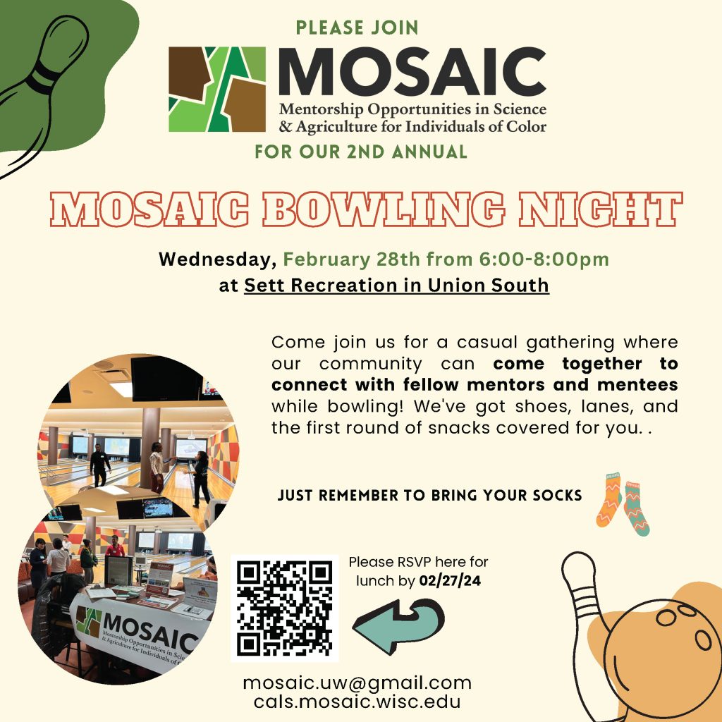 Join MOSAIC for their first community event of 2024, MOSAIC Bowling Night, on Wednesday, February 28 at Sett Recreation in Union South from 6:00 – 8:00 p.m.