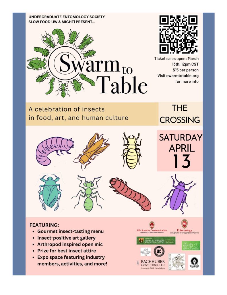 The Undergraduate Entomology Society, in collaboration with Slow Food UW and the Mission to Improve Global Health Through Innovation (MIGHTi), invite you to Swarm to Table 2024 on April 13. The event is a celebration of insects in food, art and human culture, with a gourmet tasting menu, presentations, art gallery, prizes and more.
