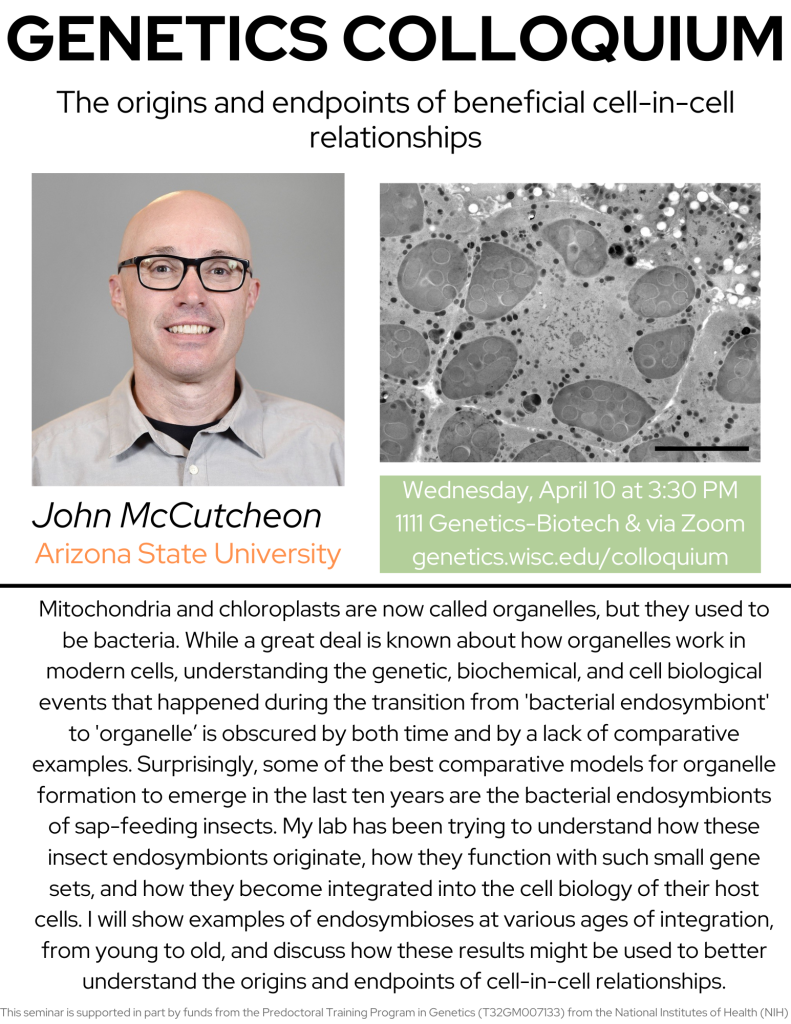 The Genetics colloquium is held Wednesdays at 3:30 p.m. in-person in Genetics/Biotech 1111 and online via Zoom. This week’s speaker is John McCutcheon from Arizona State University.