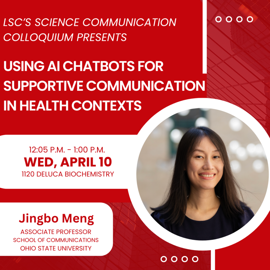 Jingbo Meng, associate professor in The Ohio State University School of Communications, will present “Using AI Chatbots for Supportive Communication in Health Contexts” at LSC’s Science Communication Colloquium on Wednesday, April 10, from 12:05 – 1:00 p.m. in 1120 DeLuca Biochemistry Building.