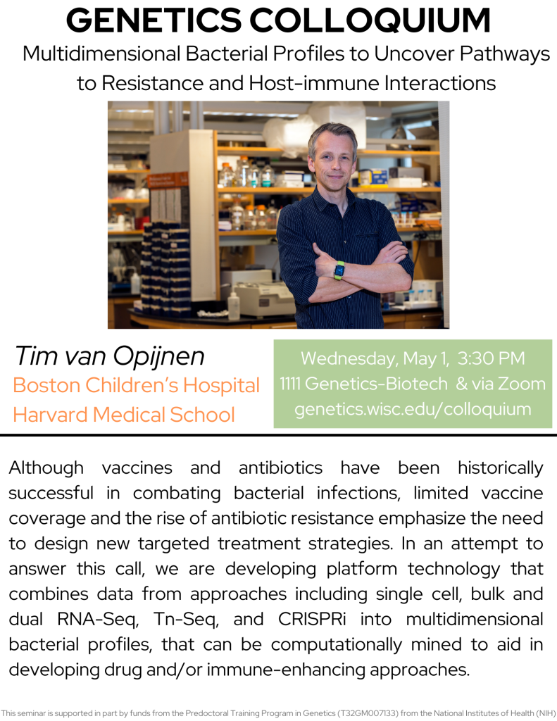 Genetics colloquium: Tim van Opijnen on multidimensional bacterial profiles to uncover pathways to resistance and host-immune interactions – May 1
