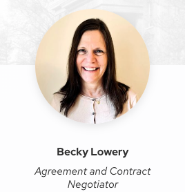 Becky Lowery is also an agreement and contract negotiator and reports to Sandy Fowler. She reviews agreements and currently works with all departments and centers. She answers questions about databases entries, the appropriate agreement for a project and timing of an agreement.