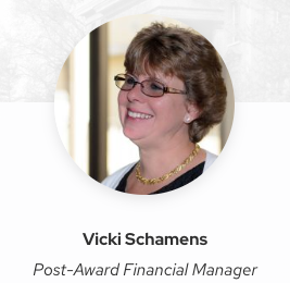 Vicki Schamens is a post-award research financial manager. She reports to Sandy Fowler and manages the post-award team. She helps researchers spend awarded money within the parameters set by the award and the University. She works with CIAS, animal and dairy sciences, entomology, plant pathology, forest and wildlife ecology and the ag research stations. She can answer questions about awards and university policy.