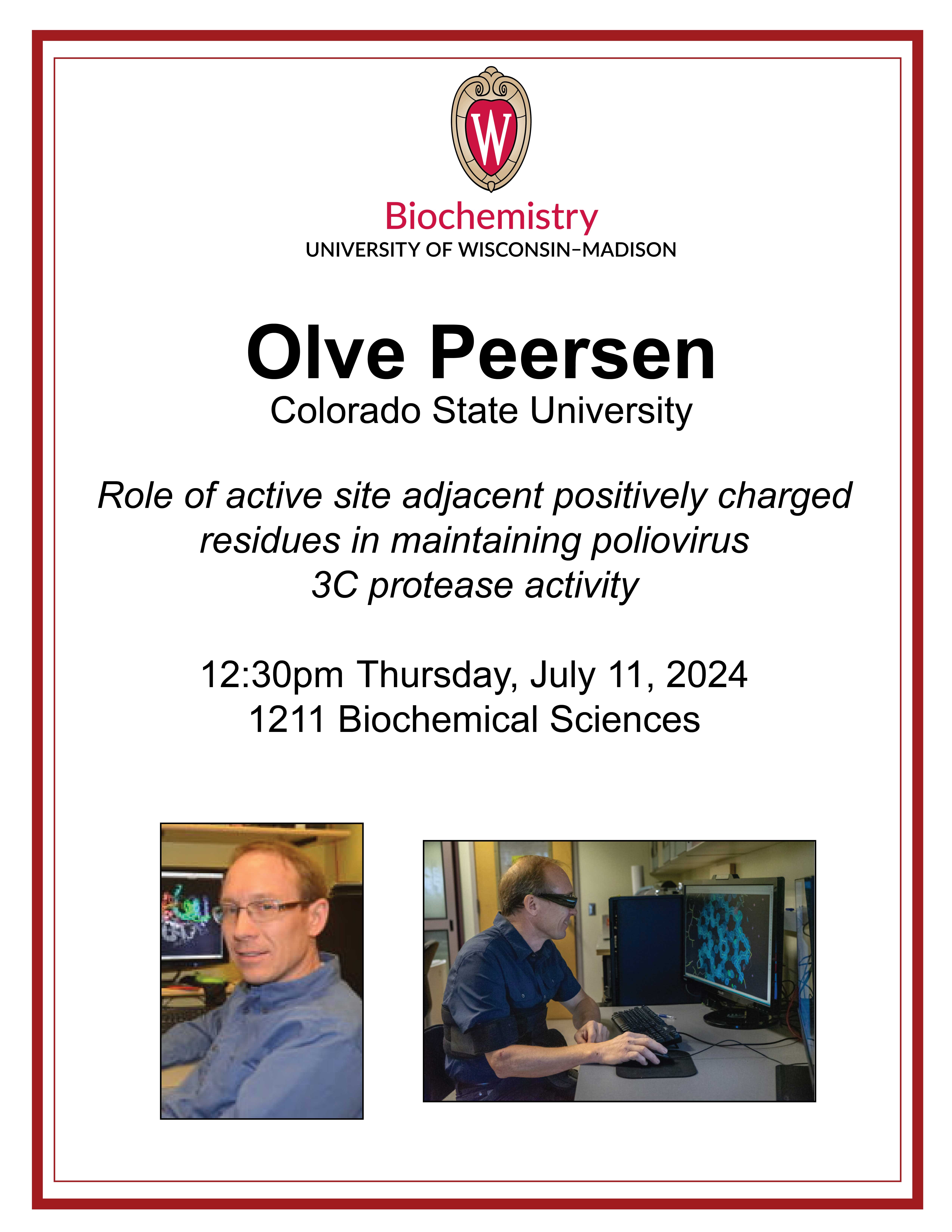 The Department of Biochemistry will host Olve Peersen from Colorado State University for a special seminar this Thursday, July 11, at 12:30 p.m. in 1211 BSB. Peersen, a biophysicist and structural biologist studying viral enzymes, will be speaking on the “Role of active site adjacent positively charged residues in maintaining poliovirus 3C protease activity.”