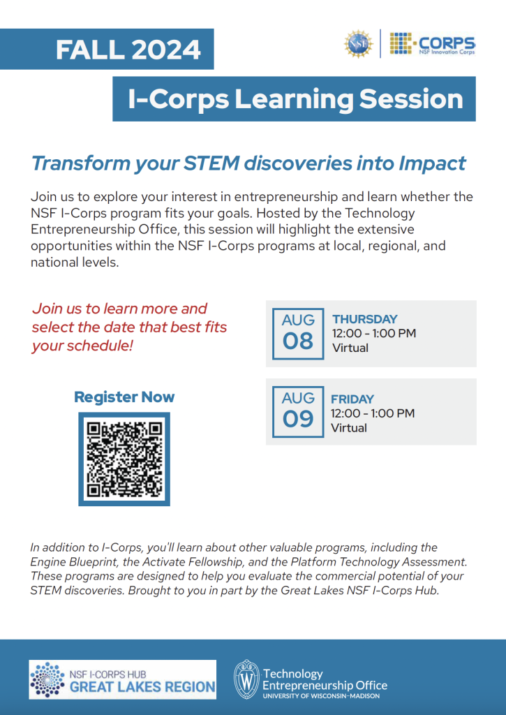 Do you want to translate your research into impactful real-world applications? Join UW-Madison’s Technology Entrepreneurship Office (TEO) to learn about how I-Corps can help you do that. By attending this learning session, you’ll gain insights to determine if the NSF I-Corps program aligns with your goals. Hear from past I-Corps participants who will share their experiences. Bonnie Bachman, Director of the Technology Entrepreneurship Office (TEO), will offer an overview of the local, regional and national I-Corps programs. Whether you’re considering entrepreneurial innovation or applying for SBIR, STTR or PFI, this session will explain how I-Corps can help you achieve your goals.