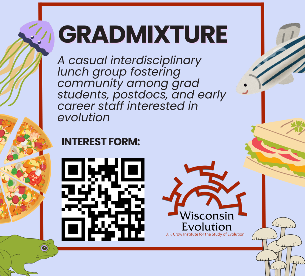 Wisconsin Evolution is excited to announce the return of Gradmixture, a casual interdisciplinary lunch group fostering community among grad students, postdocs, and early career staff interested in evolution. These meetings were a great success last spring in bringing together individuals from various departments. We offer free food, occasionally host guest speakers and provide a casual space to share your research with others. If you are interested in joining, please fill out this Google form.