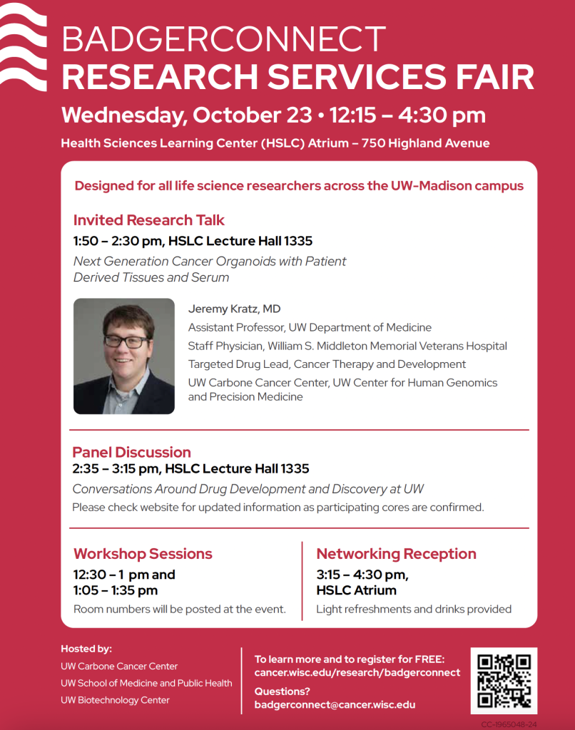 Hosted by the UW Carbone Cancer Center and UW Biotechnology Center, the BadgerConnect Research Services Fair joins UW Research Services with industry partners to showcase technologies and support available to UW–Madison researchers. Learn about innovative technologies and discuss projects with life science research services to see how your research can be supported and enhanced. This free event includes in-person workshops, a research talk by Jeremy Kratz, panel discussion, and a networking reception, along with pre-recorded flash talks and tutorials posted online – all aimed at introducing you to some of the campus resources, technologies and people available to facilitate your research. Geared to foster collaborations, this fair has multiple opportunities for researchers at all levels to network with UW life science research services, their industry partners and other researchers across campus. Learn more and register on the BadgerConnect webpage.