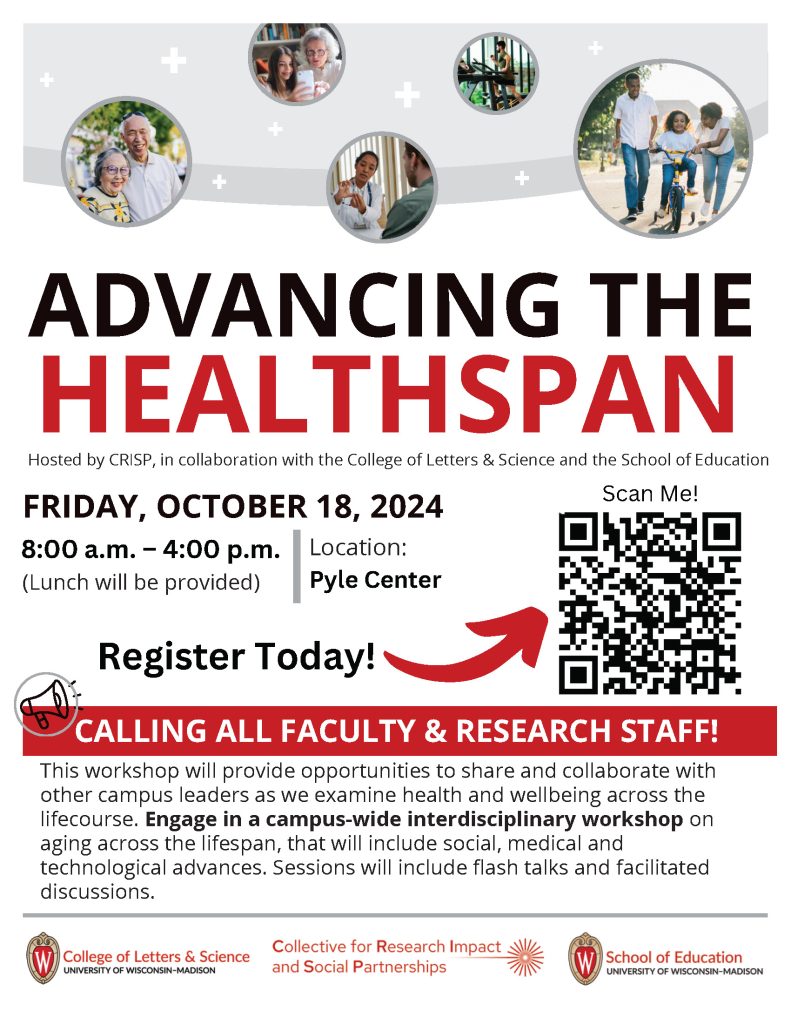 A workshop on Healthspan research efforts will be held in Madison on Oct. 18. The workshop is meant to provide opportunities for faculty and research staff who work in the area to share their work and find synergies with other campus leaders as we examine health and wellbeing across the life course. Participants will engage in a campus-wide interdisciplinary discussion on aging across the lifespan, that includes social, medical and technological advances. The different sessions will include flash talks and facilitated discussions.