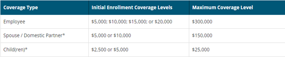 - The maximum coverage levels allowed are $300,000 employee, $150,000 spouse/domestic partner, and $25,000 child.