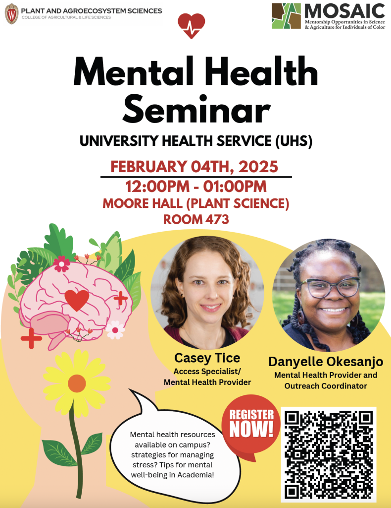Join Mentorship Opportunities in Science & Agriculture for Individuals of Color (MOSAIC) for a Mental Health Seminar on Tuesday, February 4, from 12:00 – 1:00 p.m. at Moore Hall, Room 473. The seminar is provided by University Health Services (UHS), and guest speakers are Danyelle Okesanjo, mental health provider and outreach coordinator, and Casey Tice, access specialist/mental health provider from CALS. Together, they will share valuable information about the mental health resources available on campus, strategies for managing stress and tips for fostering mental well-being. Attendees will have the opportunity to ask questions, learn about how to access support services and explore ways to normalize conversations around mental health.