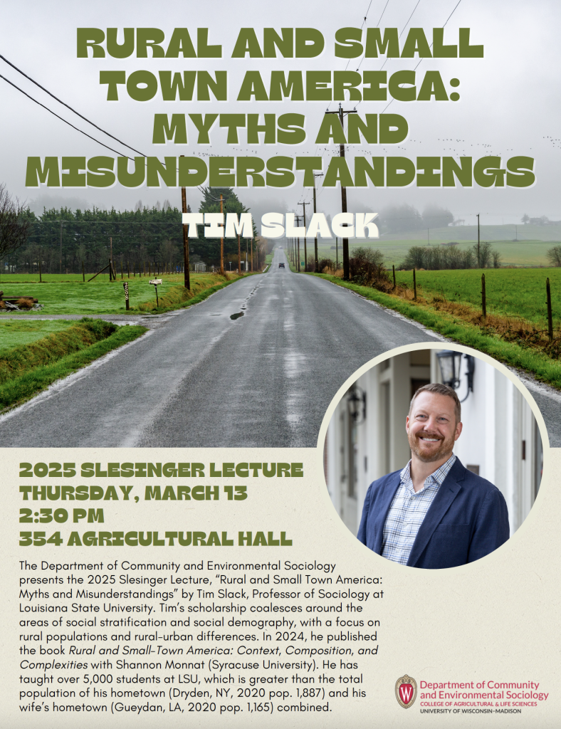 The Department of Community and Environmental Sociology is welcoming Tim Slack, professor of sociology at Louisiana State University, to give the Slesinger Lecture in 2025. The event will take place on March 13 at 2:30 p.m. in 354 Agricultural Hall. His talk is entitled “Rural and Small Town America: Myths and Misunderstandings”.