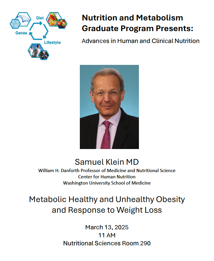 Sam Klein, MD, will present “Metabolic Healthy and Unhealthy Obesity and Response to Weight Loss” on Thursday, March 13. The event will take place at 11:00 a.m. in Room 290 of the Nutritional Sciences building.