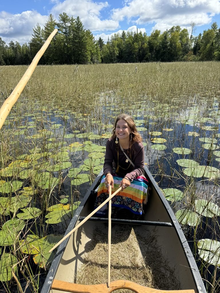 Boozhoo, hello, my name is Sagen Lily Quale, and I am an enrolled citizen of the Red Cliff Band of Lake Superior Ojibwe. I’m in my first year of UW’s agroecology master’s program. I’m someone who enjoys working with and in Indigenous food sovereignty projects, and I’m a farmer and a harvester of manoomin, or wild rice. My work focuses on gathering stories about manoomin and using that knowledge to lead stewardship of this plant relative.
