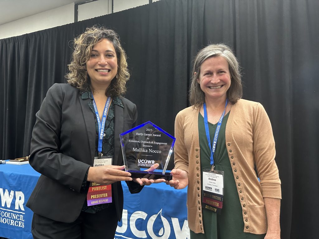 Mallika Nocco, assistant professor and extension specialist in the Department of Biological Systems Engineering, was selected to receive the 2025 Early Career Award for Extension/Outreach/Engagement from the University Council on Water Resources (UCOWR). She accepted the award during a recognition ceremony at UCOWR’s annual conference on June 4.