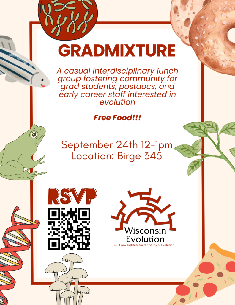 Wisconsin Evolution is announcing the return of Gradmixture, a casual interdisciplinary lunch group fostering community among grad students, postdocs and early career researchers interested in evolution. The group offers free food, hosts guest speakers and provides a casual space to share research.