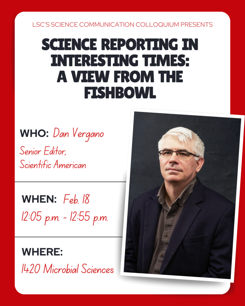 Dan Vergano, senior editor at Scientific American, will present “Science reporting in interesting times: A view from the fishbowl” at LSC’s Science Communication Colloquium on Wednesday, Feb. 18, at 12:05 p.m. in 1420 Microbial Sciences.