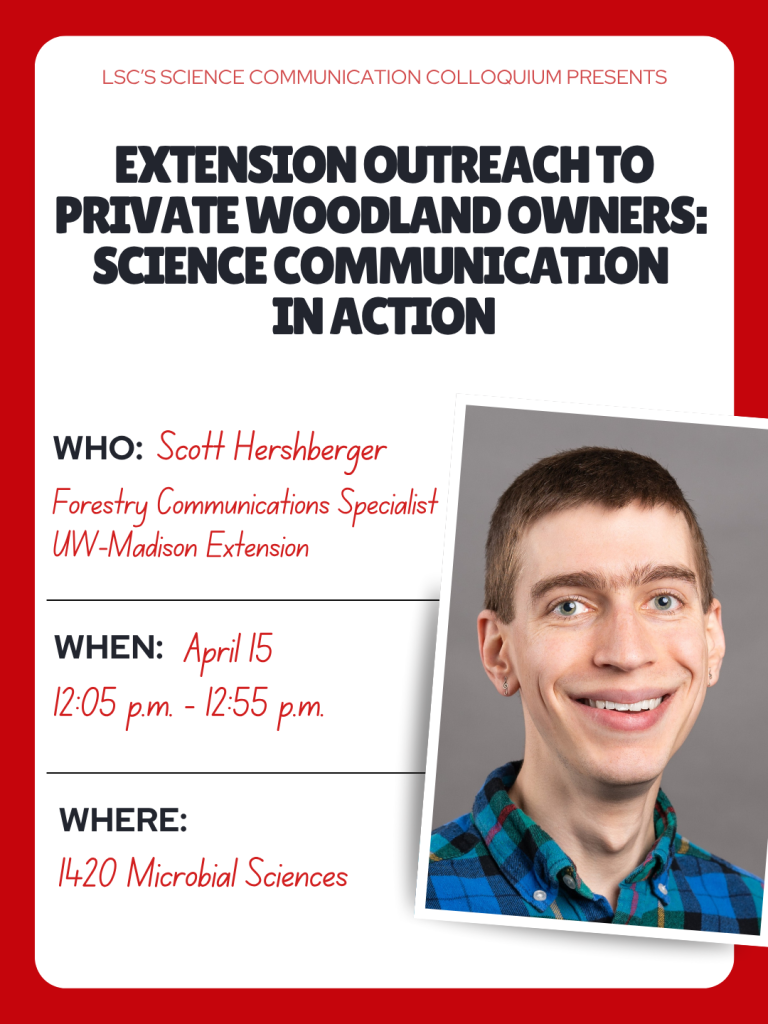 Scott Hershberger, forestry communications specialist in the UW–Madison Division of Extension, will present “Extension outreach to private woodland owners: Science communication in action” at LSC’s Science Communication Colloquium on Wednesday, Apr. 15, at 12:05 p.m. in 1420 Microbial Sciences.